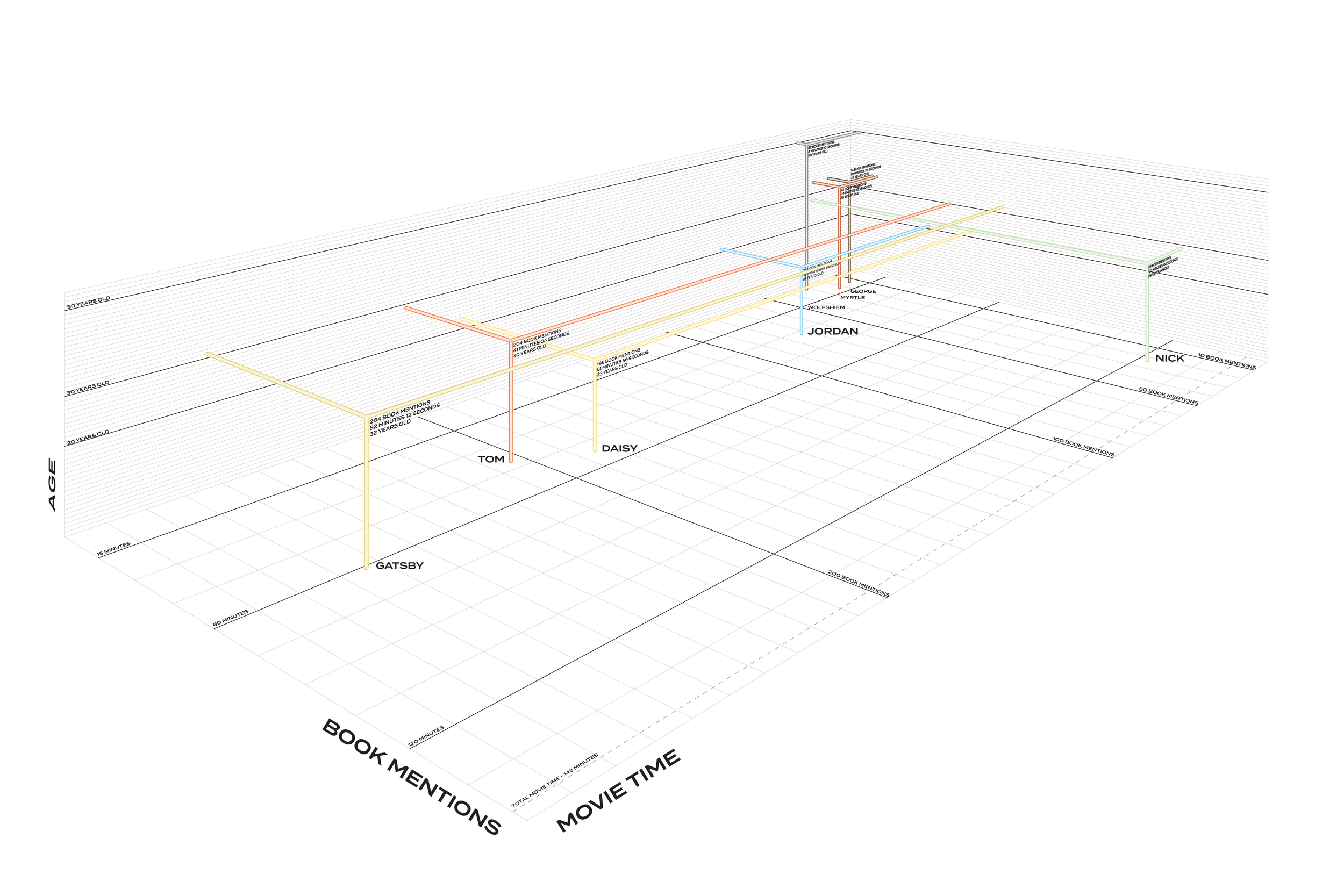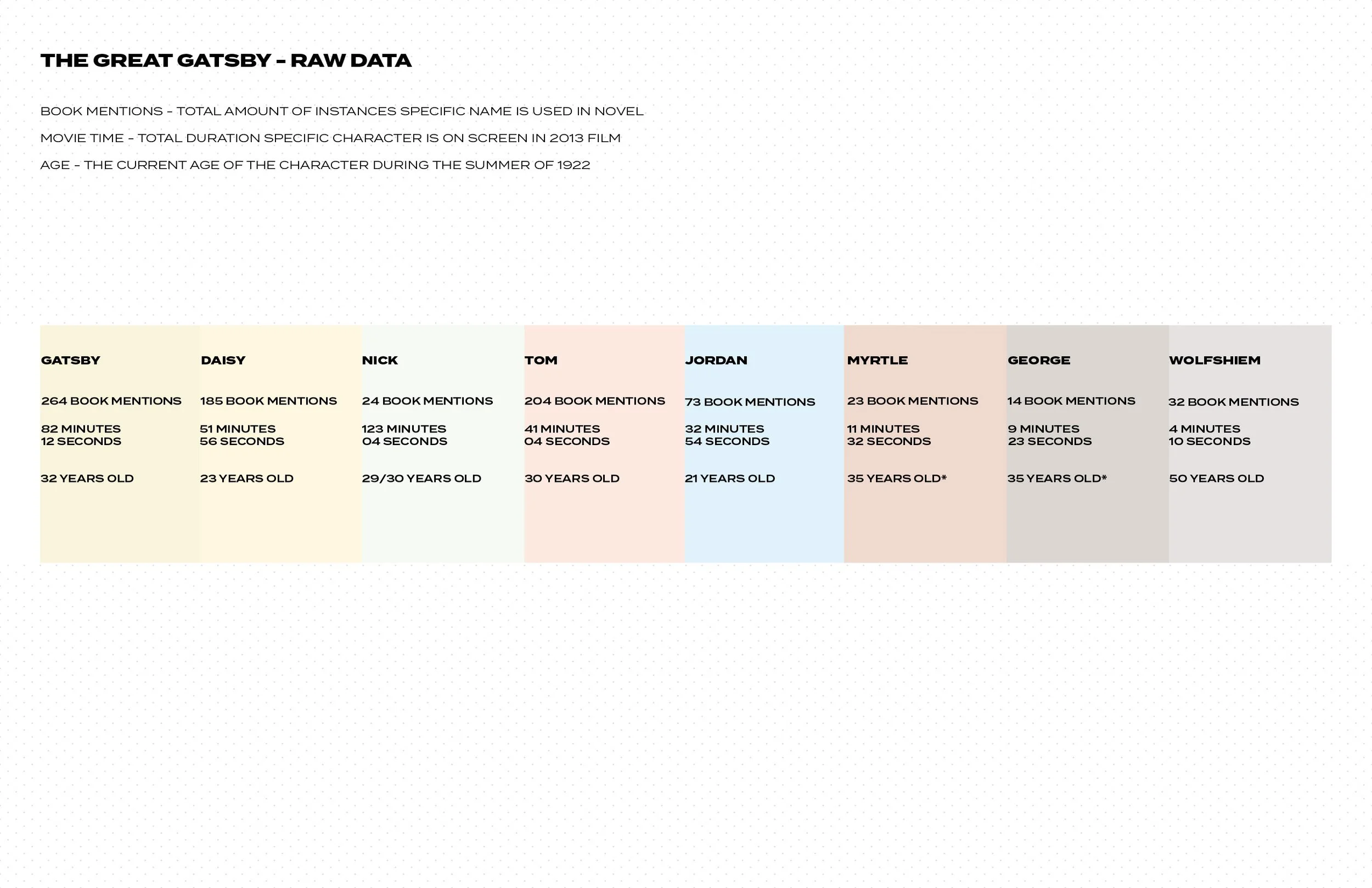 For “The Great Gatsby”, the number narrative I wanted to read was how often different characters were mentioned in the book vs the movie.